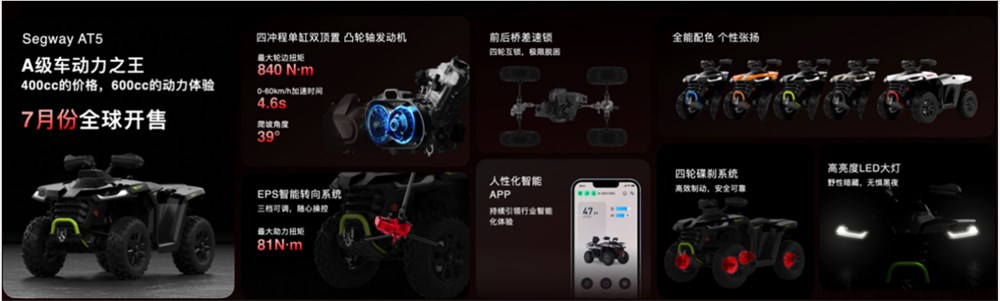 這款被譽為“A級車動力王”的 Segway AT5 全地形車,在發(fā)布會上大放異彩。它擁有強勁的動力和卓越的配置,600cc的動力搭配400cc的售價,為駕車者帶來了更加震撼的越野感和更具心動的價格。Segway AT5 采用的是全自主研發(fā)的四沖程單缸雙頂置凸輪軸發(fā)動機,其最 高速度為100km/h,最 大車輪轉(zhuǎn)矩為840N·m,0-60km/h的加速時間只需要4. 6 秒,這樣強勁的動力性能使得它的駕駛員能夠在任何復雜的地形中暢通無阻。