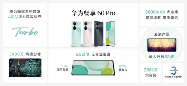 延續暢享系列的長續航基因,全新發布的華為暢享60 Pro擁有5000mAh大電池和40W華為超級快充Turbo,為用戶帶來持久的續航能力;經典星耀雙環設計,呈現時尚對稱美學;手機搭載5000萬高清影像系統,提供無懼黑夜的影像體驗。
